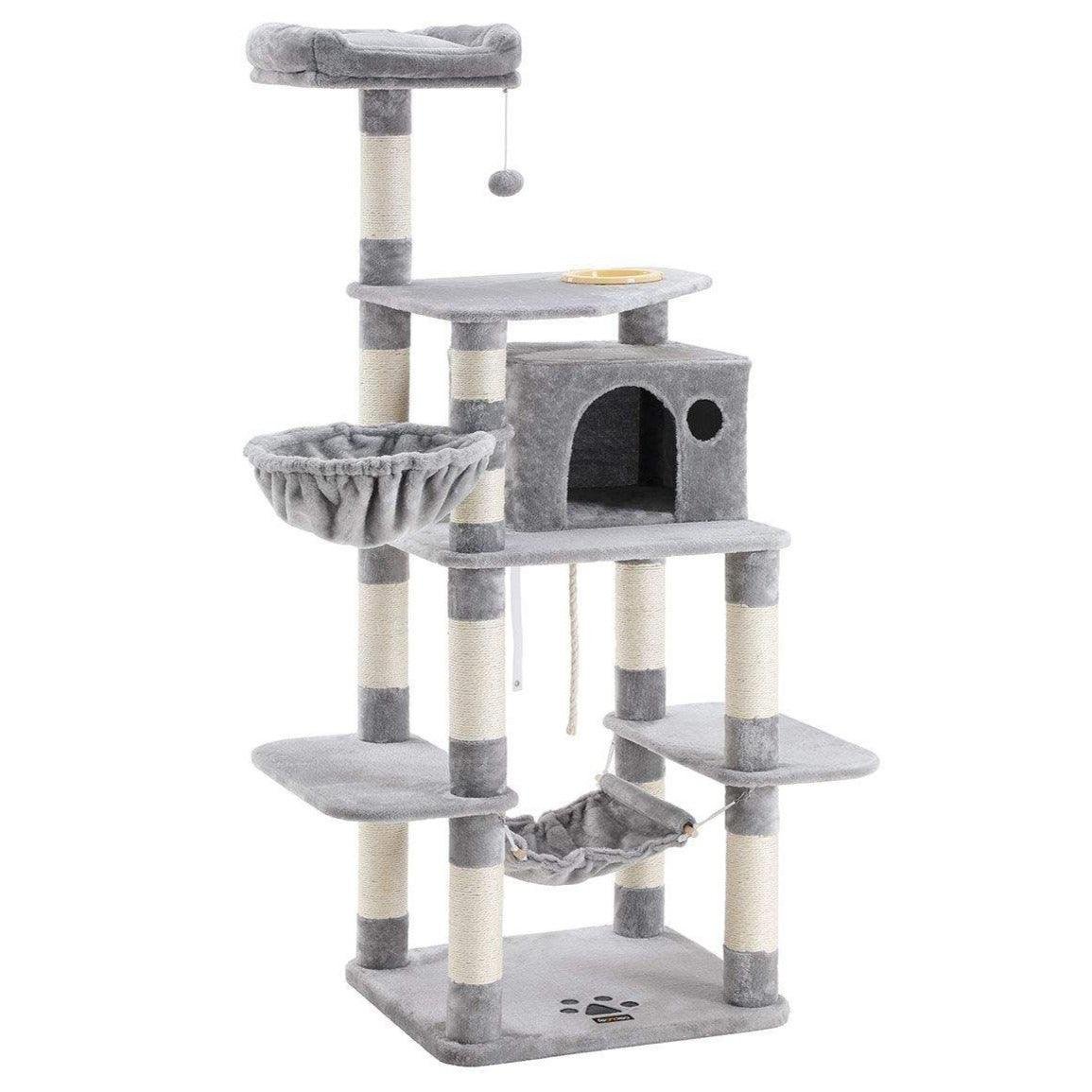 Arbre à chat hauteur de 174 cm multi-niveaux avec bol panier niche maison de jeu meubles pour chatons chats et félins couleur grise claire 12_0001175
