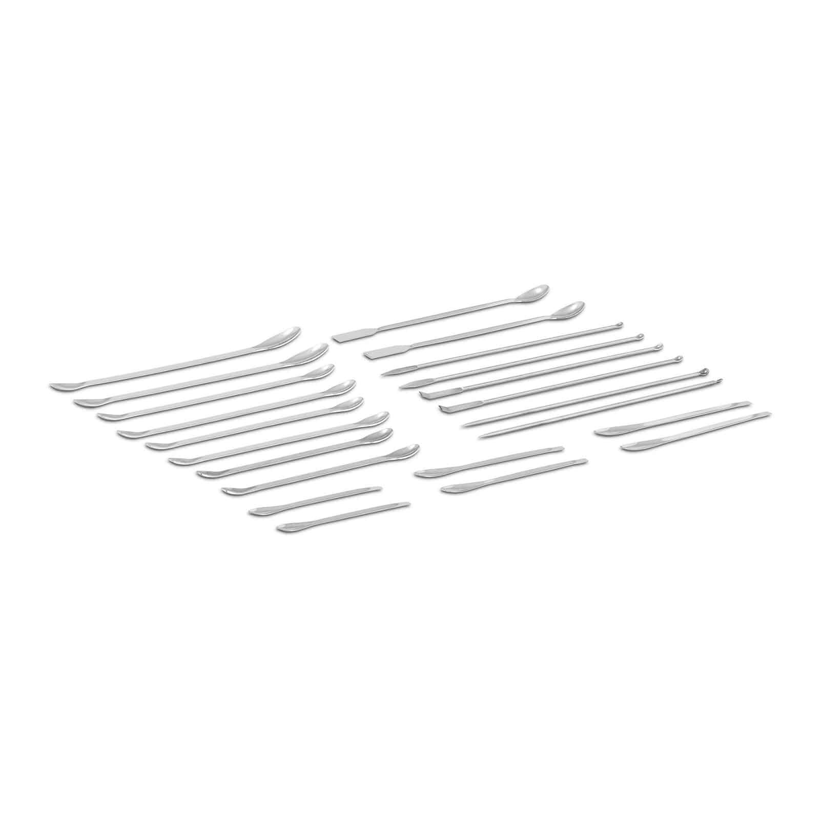 Il contient : deux cuillères de laboratoire doubles de 160, 180, 200 et 220 mm ; deux spatules et cuillères concaves de 105, 120 et 140 mm ; deux fois trois micro-cuillères de 220 mm ; et deux cuillères/spatules de 200 mm.