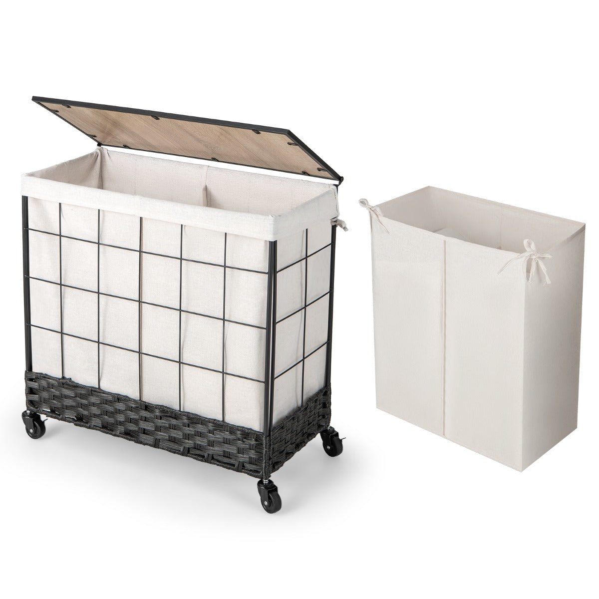 Panier à linge avec roulettes verrouillables panier à linge robuste de 130 l avec couvercle en bois sac à doublure amovible divisé 20_0008981
