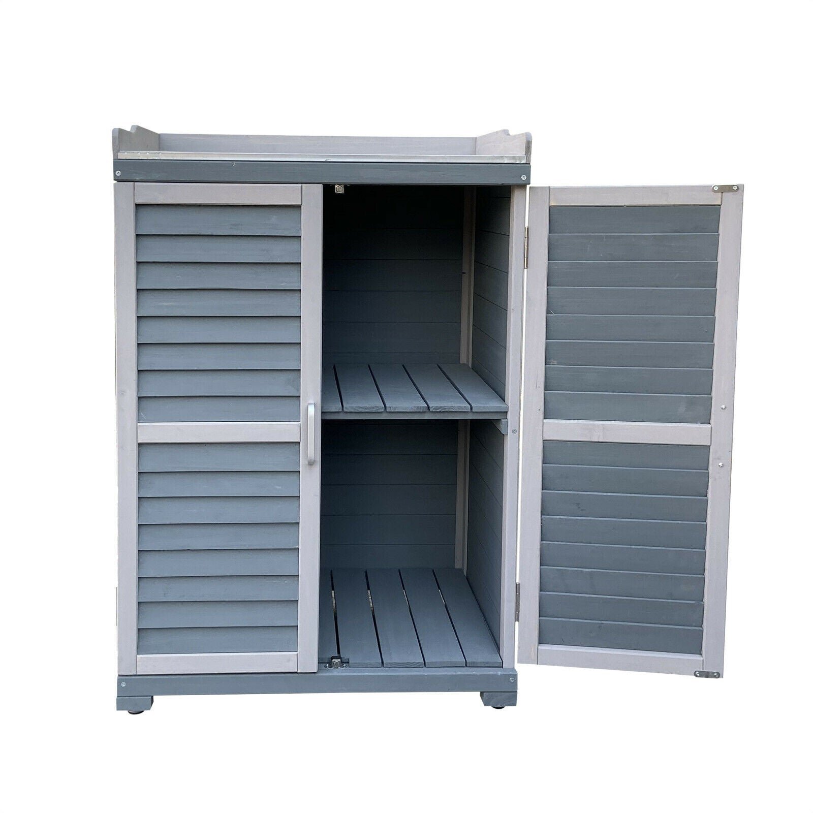 L’armoire de jardin de conception intelligente, est munie d’une surface large à votre hauteur et de deux étagères en dessous. Par ailleurs, le meuble repose sur quatre pieds en bois, de sorte qu’il n’y ait pas de contact direct avec le sol, empêchant par ce biais, la pénétration de l’humidité par-dessous.